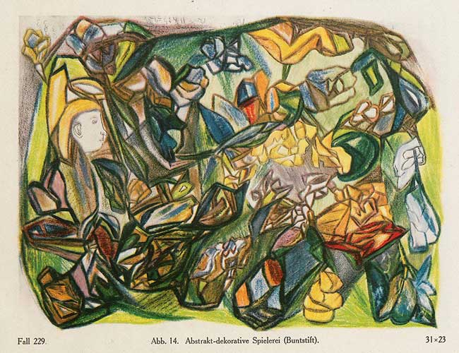 I grabbed this image because it’s with crayon and reminded me of an art project we did when we were kids. (Except ours looked like it had been done by kids.) Artist: Hans Prinzhorn (1922) from Bildnerei der Geisteskranken.