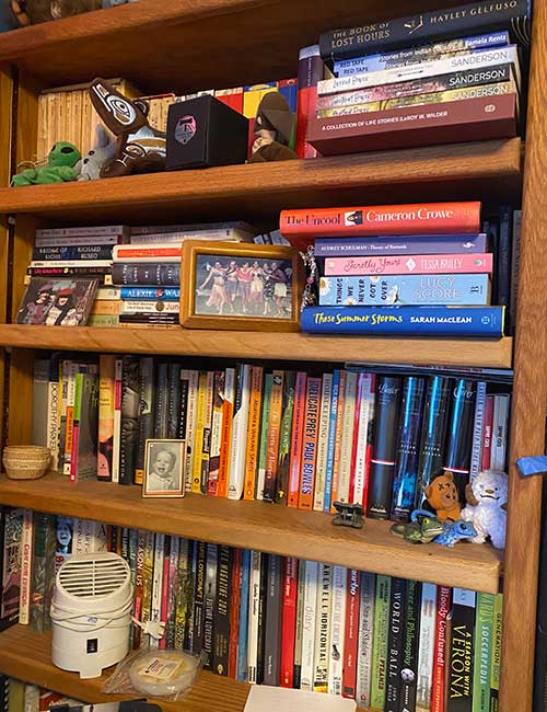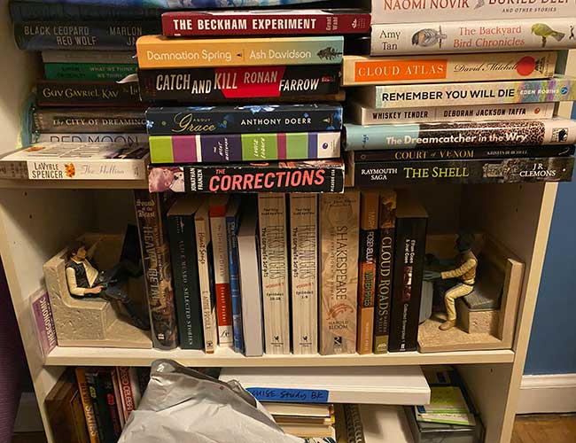 I’m not sure the last time I took a photo of this bookshelf. The two on this post are my main shelves with the “to read” or “I intend to read” or “Sure, someday I’ll get to it.” I don’t often take paper books on the bus just because I already carry so much stuff. I’m always in awe of the people who carry hardcovers on the bus. I want that to be me.